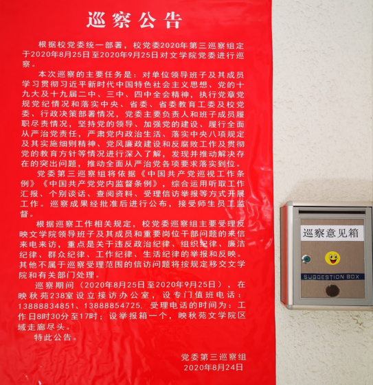 公司党委第三巡察组定于2020年8月25日至2020年9月25日在伟德国际victor1946开展巡察工作。进驻期间,巡察组接访办公室设在东陆校区映秋院233室和238室,巡察组将安排专人值班,接待师生来访、来电。同时在东陆校区映秋院西侧一楼至二楼楼梯间设立巡察意见箱,供伟德国际victor1946师生向巡察组提交意见、建议。巡察期间,巡察组办公室接访电话为:13888834851、13888854725。
