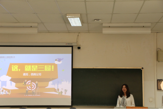 宣讲会首先由中建三局西南公司进行宣讲。中建三局西南公司项目杨书记首先用中建三局承建的“雷神山”、“火神山”医院的的例子拉近了公司与同学们之间的距离。随后,从“红”、“大”等方面对中建三局西南公司进行了细致的介绍。杨书记在宣讲中提到,中建三局西南公司不论从思想上、业绩上都展示出了出众的央企担当。同时,她还从入职培训、人才培养、薪酬、福利、活动等多方面介绍了中建三局西南公司的情况。她表示,处在毕业年级的同学们既应该脚踏实地,又应该抬头看天,中建三局西南公司时刻欢迎同学们的到来。
