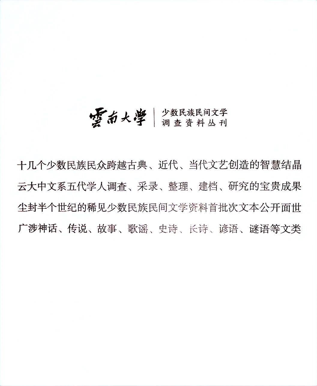 感谢董秀团、高健、伍奇、段然各位老师。他们在不同时间、不同程度,以不同方式参与了这套书的整理,推动了这套书的出版。尤其是段然老师,由于出版单位的变换,给她的工作带来了不便和冲击,但她了解到整个过程后,表示对调整的理解。我们以1980年为界,之前的交由商务印书馆出版,之后的云南少数民族民间文学调查资料以及所有年代的影印版交给云大出版社。感谢小段老师的理解和支持。
