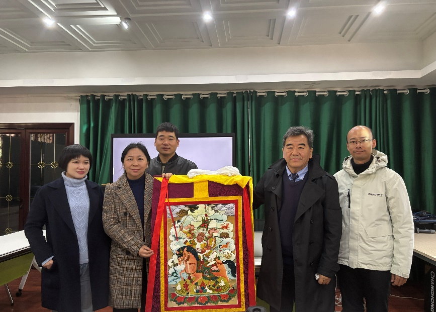 在互动环节,教研室师生积极提问,与诺布旺丹教授展开了一场深入且富有成效的学术讨论,为讲座画上了圆满的句号。讲座结束后,诺布旺丹教授一行人赠送伟德国际victor1946民间文学教研室一幅格萨尔唐卡。