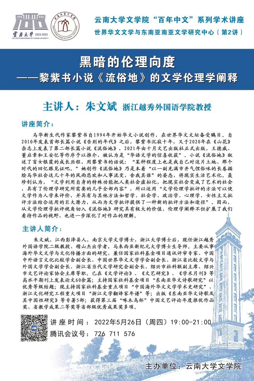 朱文斌教授讲座预告(5月26日):黑暗的伦理向度——黎紫书小说《流俗地》的文学伦理学阐释