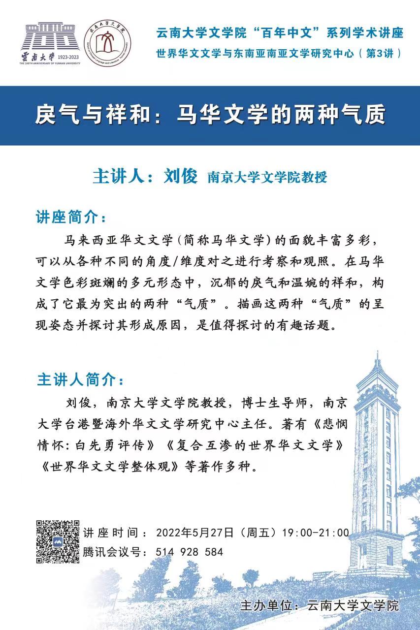 刘俊教授讲座预告(5月27日):戾气与祥和:马华文学的两种气质