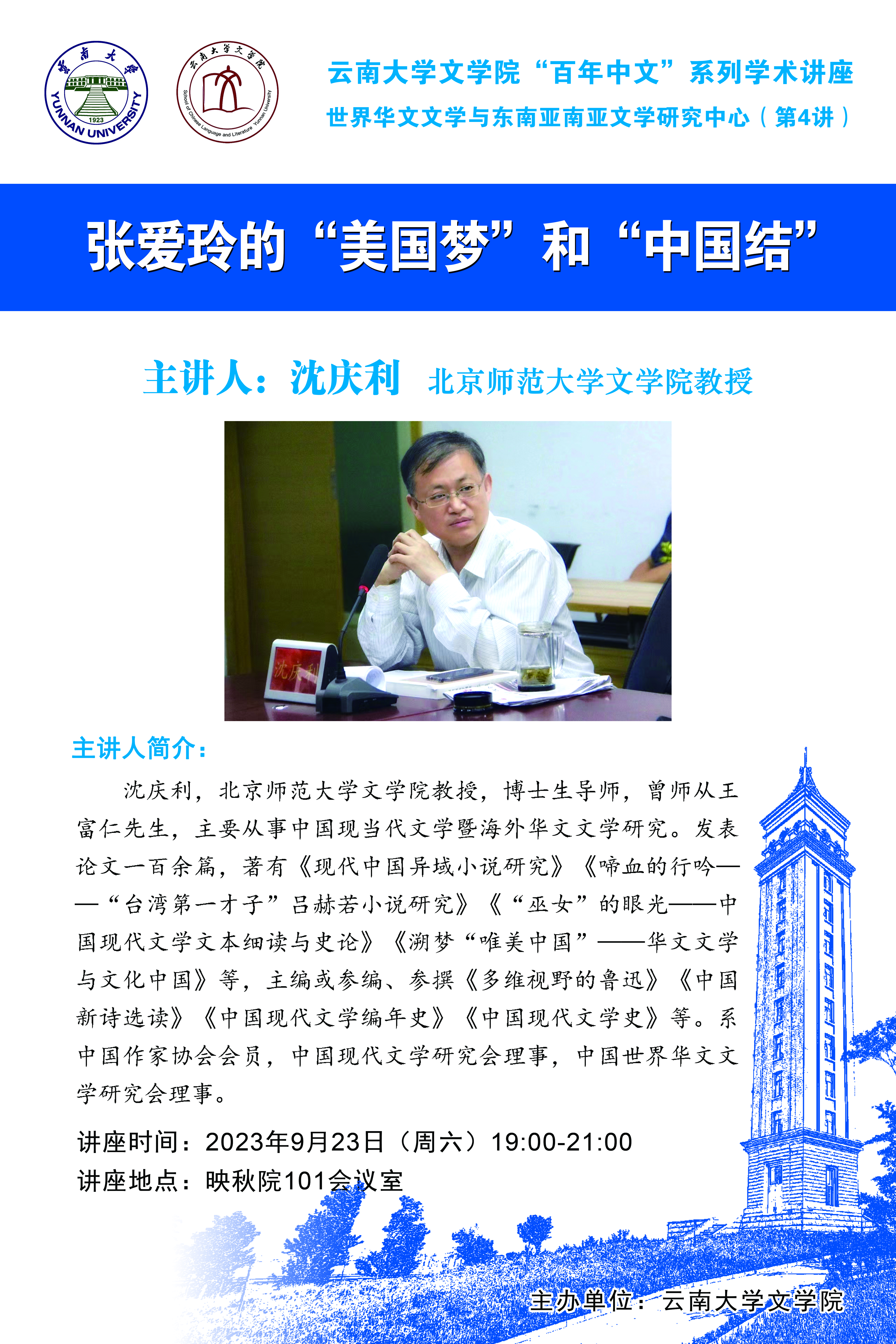 沈庆利教授讲座预告(9月23日):张爱玲的“美国梦”和“中国结”