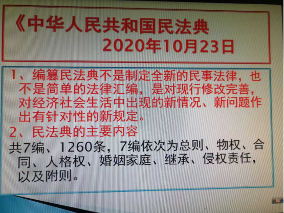 在本次学习中,公司党委书记赵永忠带领全院教职工从两个方面加强对《中华人民共和国民法典》的学习。一是介绍了《中华人民共和国民法典》的编篡情况:编纂民法典不是制定全新的民事法律,也不是简单的法律汇编,是对现行修改完善,对经济社会生活中出现的新情况、新问题作出有针对性的新规定。
