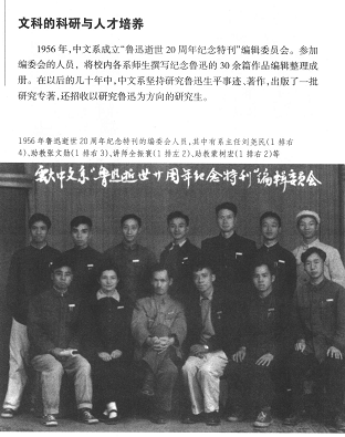 1956年,中文系成立“鲁迅逝世20周年纪念特刊”编辑委员会,将校内各系师生撰写的纪念鲁迅的30余篇作品编辑整理成册。在之后的几十年中,中文系坚持鲁迅生平事迹、著作的研究,诞生了诸多鲁迅文学、思想的研究者,全国知名的鲁迅研究专家蒙树宏先生便是其中之一。