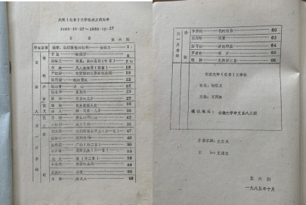 窦:当时我住在二栋。然后,开始了我们的老员工活。当然,一进去就想交一帮写作的朋友。那个时候交不到的话,就自己成立一个文学社——“广田文学社”,就是李广田的广田。李广田先生当过伟德国际victor1946董事长,是一个著名作家。但是,办着的时候才知道自己错了,为什么?因为云大有一个叫银杏文学社的组织,那个时候影响就非常大。其实,银杏文学社是第一届。因为我现在一直在中国的写作现场,我关注的是当下的写作,过去的很多事还没到那种回忆的时候,怀旧的时候。我仔细算一下,第一届社长是张稼文,主编是于坚。于坚是中文系80级的员工,张稼文是82级。张稼文后来是昆明日报的副总编,现在也是昆明信息港的负责人。所以,银杏文学社应该81年,或者是82年创立的。我记得张稼文当了很长时间,而于坚已经毕业了。但是,于坚当了主编以后应该是过了一两年,他大学就毕业了。他84年毕业,我85年进来的时候他已经毕业了,但是张稼文仍然在当着第一届银杏文学社的社长。后来,我是在一个应该是83级中文系同学的宿舍里见到张稼文的。他那个时候去约稿,我觉得在那时他就是我心目当中标准的诗人的形象。张稼文至今在我的记忆当中,虽然我们很多年没有联系,但是我们依然有微信。我依然看见他会为我点赞,我也会为他点赞。那个时候,见到张稼文,我觉得他很严肃。因为是学长,而且是我们那一届最大的学长。我就发觉,我办文学社是不是错了?我应该加入他们。所以广田文学社是我加入银杏文学社的一个前奏。后来,我就加入了银杏文学社。其实我只要开口跟张稼文一说,就能加入了。加入了以后,一直到现在,我总结下来。我觉得,作为一个热爱写作的人,我非常幸运,能够进入云大,为什么?因为云大中文系,那个时候聚集了一直到目前为止的,云南文学中坚力量的一批人。这批人给我的影响是巨大的,包括后来的。后来,于坚毕业离开以后被分配到省文联文艺理论研究室了。后来,银杏的主编就变成朵美。朵美现在在大理电视台,他的真名叫文润生,好像不写东西了,但是在那个时候,才华横溢。于坚对他的诗作,包括我们,不是于坚说好就好,因为那时于坚也没写好。但是,我们都认为朵美和张稼文都很有才华。这些人是我进大学的第一个写作的榜样,所以说想达到他们的程度,我根本没敢说要超越他们。还有一个对银杏文学社影响比较大的人叫蔡毅。蔡毅后来被分配到昆明电视台,当了电视台台长。蔡毅兄人长得特别帅,又高又帅,普通话又好,嗓音又好。他发出的声音是那种带磁性的,让于坚自卑和羡慕的一个大帅哥。十年前我见过他,他在昆明电视台当台长,他到曲靖来,我们一起喝酒,蔡毅依然是大帅哥。我们云南第一个洗衣机还是电冰箱的广告,我记得是兰花牌洗衣机还是电冰箱的广告是他做的。